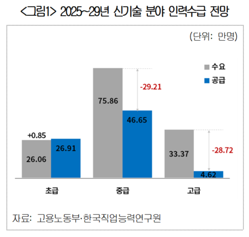 대한상공회의소(회장 최태원)가 김인자 한국과학기술기획평가원(KISTEP) 연구위원에 의뢰해 12일 발표한 ‘K-성장시리즈(10): 이공계 인력부족 실태와 개선방안’보고서에 따르면, “2029년까지 AI, 클라우드, 빅데이터 등 신기술 분야의 중급인재가 29만2천여명이 부족하고, 고급인재는 28만7천여명 가량이 부족하다”며 “이는 AI 기반 기업의 성장동력을 약화시킬 수밖에 없다”고 지적했다.