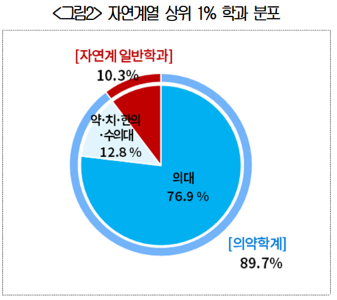 실제, 2025학년도 자연계열 정시 학과 분포를 보면 상위 1%에서 의대가 76.9%를 차지하고, 일반학과는 10.3%에 불과했다. 김인자 연구위원은 “전공 선택 단계뿐만 아니라 이공계 내부에서도 이탈이 나타난다”며 “KAIST에서는 2021~23년 동안 의·치대 진학을 위해 자퇴한 학생이 182명에 달해 이공계 의대쏠림은 앞으로도 지속될 전망이므로 대응책 마련이 선결 과제”라고 말했다.