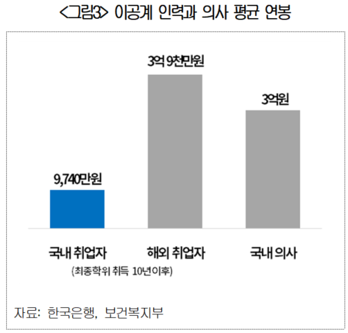 우선 이공계 인력의 보상수준은 의사 등 전문직에 비해 현저히 낮았다. 국내 취업한 이공계 인력이 최종학위 취득 후 10년이 지난 시점에 받는 평균 연봉은 9,740만원으로 해외 취업자 평균 연봉(3억 9천만원)의 1/4 수준에 불과하고, 국내 의사 평균 연봉 (3억원)의 1/3 수준이다. 이 같은 격차를 해소하기 위해서는 연공서열에 의한 인사보상 체계를 성과 중심의 인사·보상체계로 전환해 실질적 혜택으로 이어질 수 있도록 해야 한다.